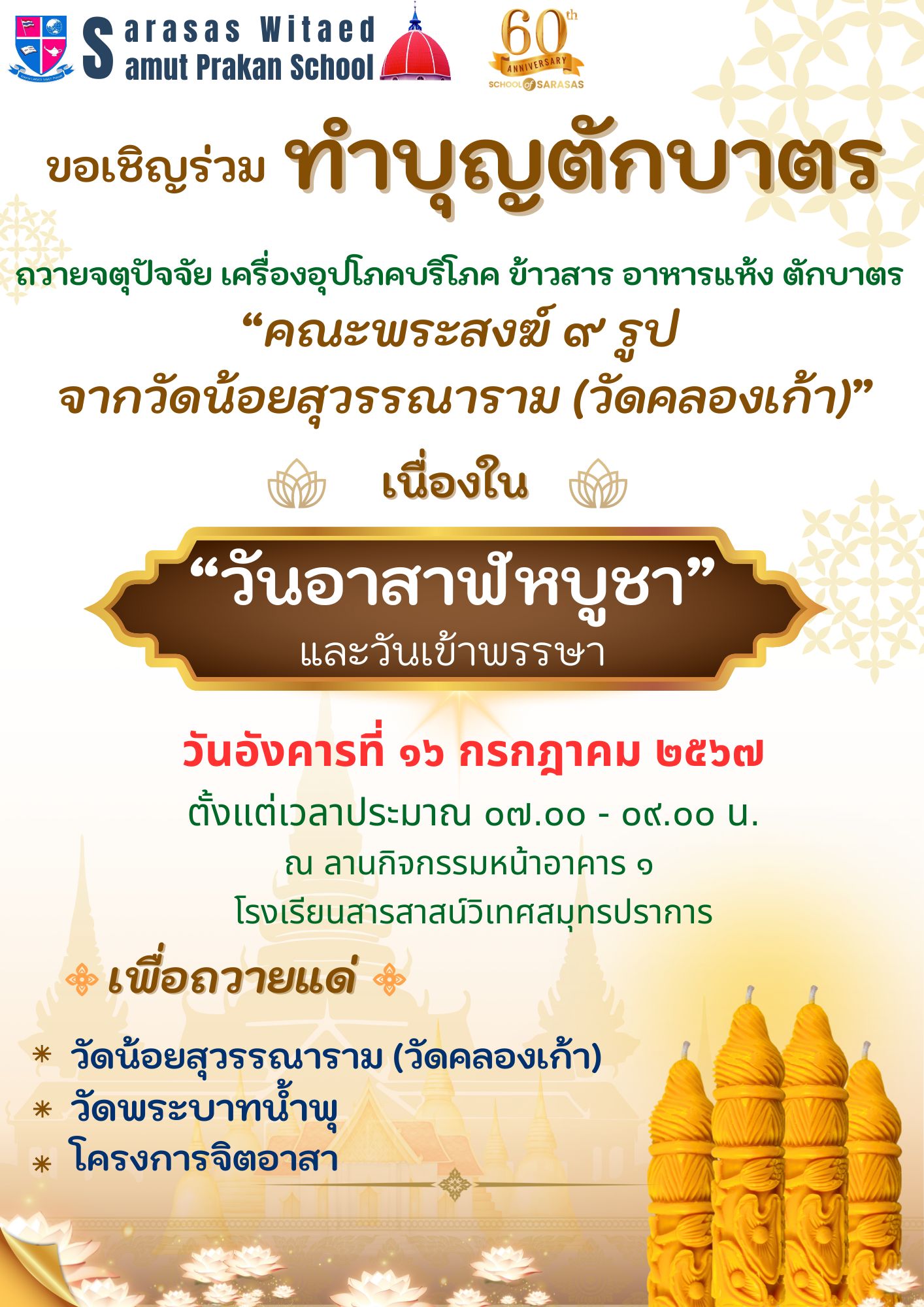 ขอเชิญร่วม ทำบุญตักบาตร ถวายจตุปัจจัย เครื่องอุปโภคบริโภค ข้าวสาร อาหารแห้ง ตักบาตร “คณะพระสงฆ์ ๙ รูป จากวัดน้อยสุวรรณาราม (วัดคลองเก้า)”